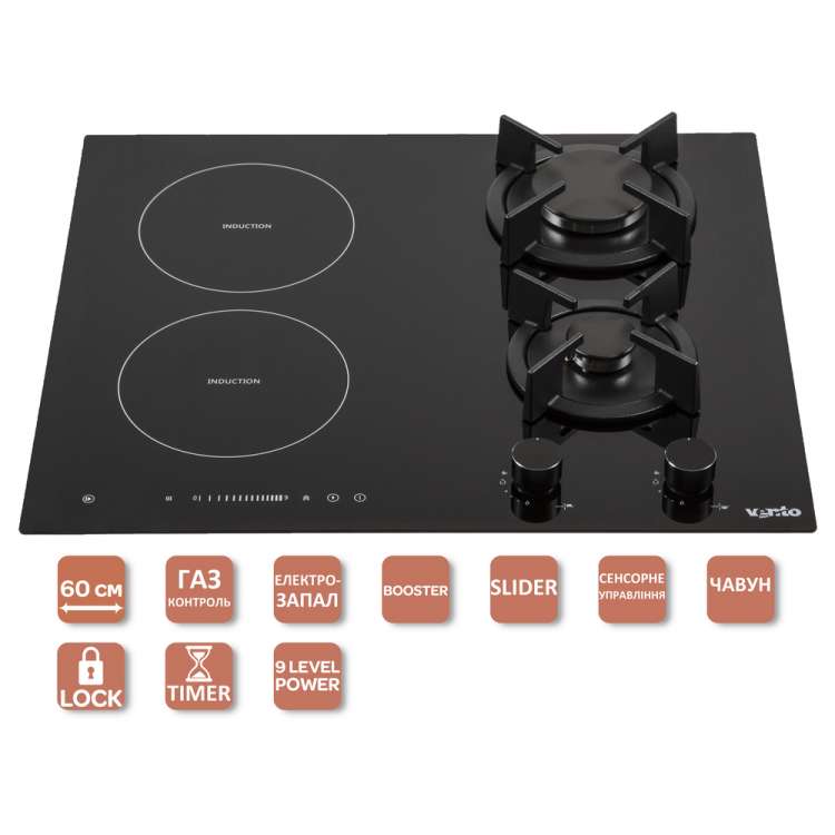 сенсорное упарвление, SLIDER, BOOSTER, Stop&Go, Keep warm, таймер, 9 режимов приготовления, замок от детей, индикатор остаточного тепла, газ. контроль ORKLI (Made in Spain), закаленное стекло, ручки управлення из нерж.стали